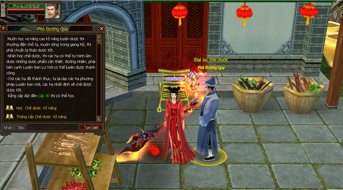 + Dùng nguyên liệu từ nghề Hái Dược và đứng gần lò luyện đan ở gần các NPC dạy nghề để tiến hành chế dược.