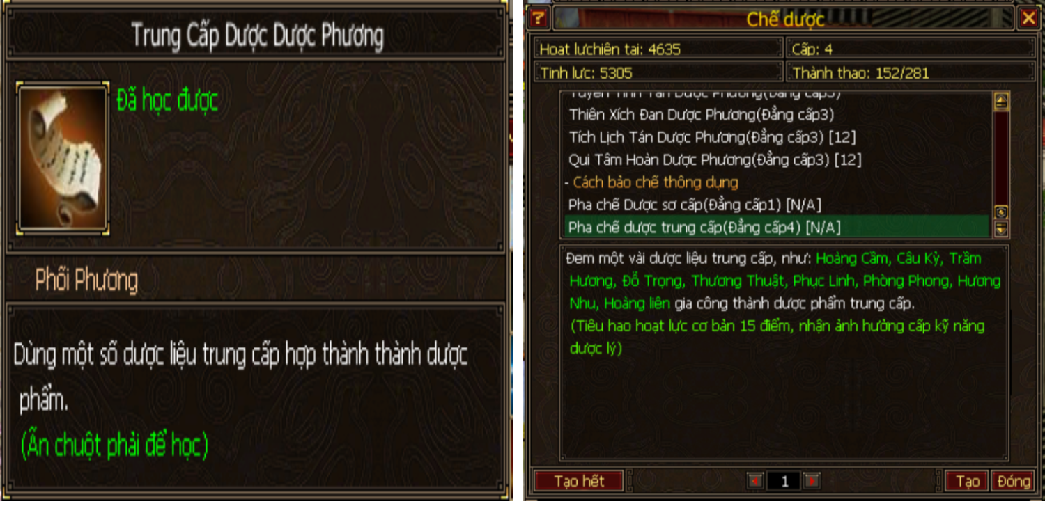 - Các Dược Phương cao cấp hơn có thể mua ở NPC trong Bang Hội.
