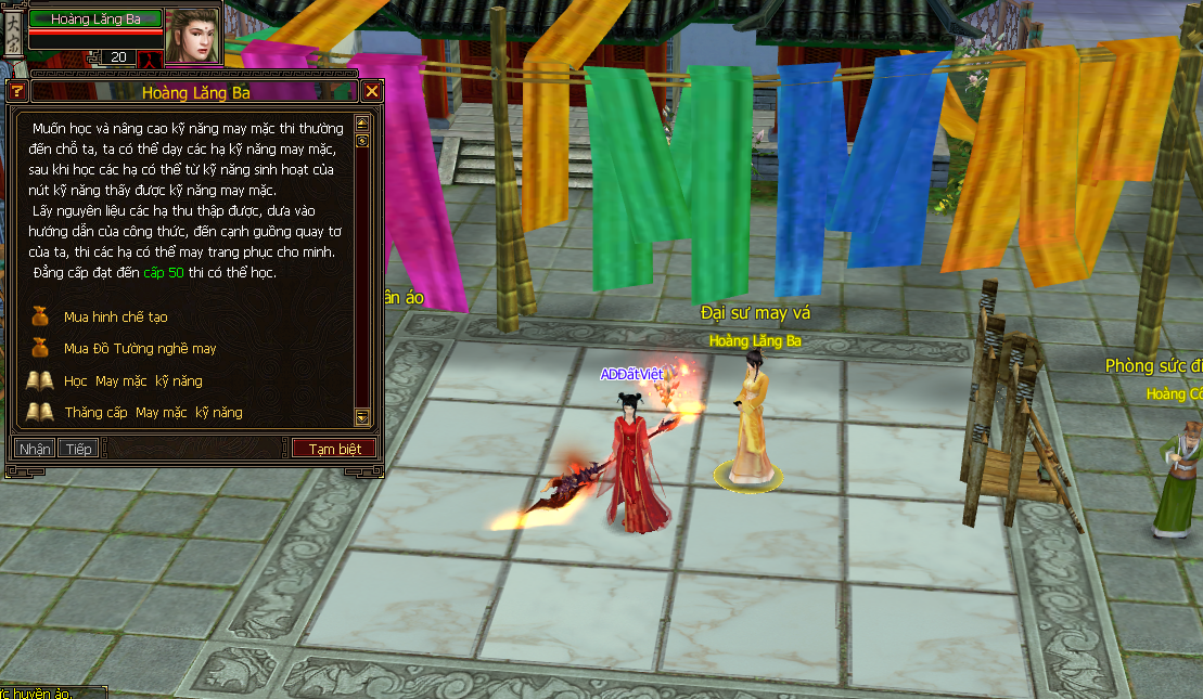 - Lưu ý : Phải đứng gần các bàn may vá bên cạnh các NPC dạy nghề mới tiến hành may mặc được nhé !!