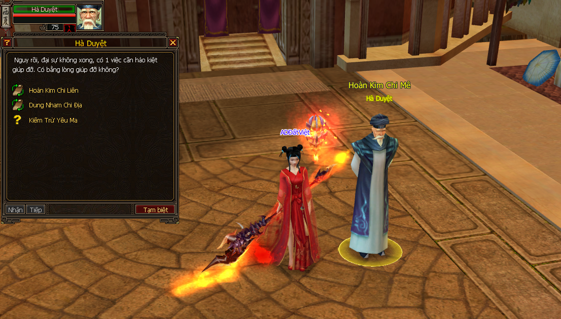 + Khi trả nhiệm vụ (trả Q1) NPC Hà Duyệt sẽ giao cho bạn 1 bức thư quan trọng có tên : Thư của Hà Duyệt (Đạo Cụ dùng để đi tiếp Q2)
